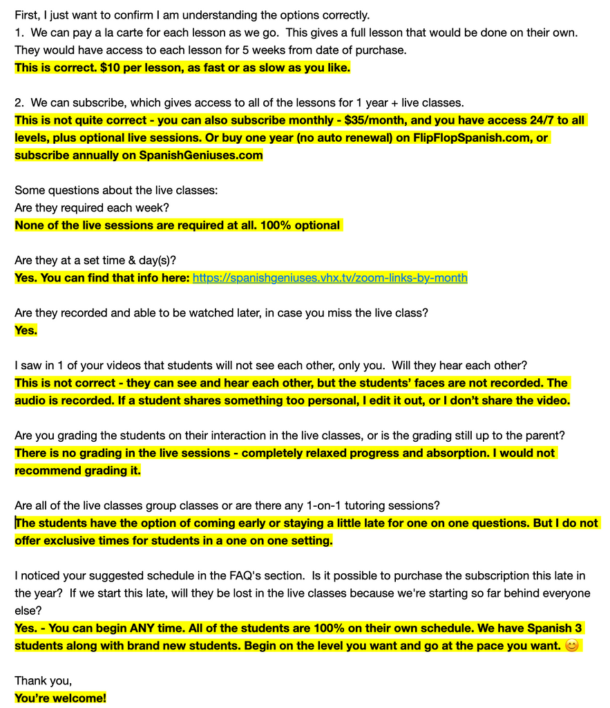 For more information please see our Spanish Geniuses FAQ page FULL of videos to answer your questions.